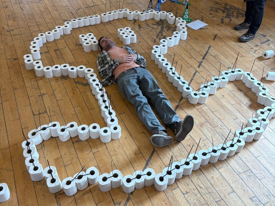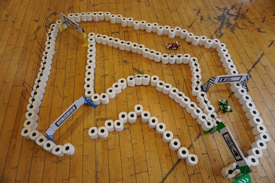 Είναι τρέλα. Όλοι σκυμμένοι στις οθόνες, το χαρτί υγείας να περνάει αστραπιαία, οι συμπαίκτες να φωνάζουν. Χαρά και απογοήτευση καθώς τα αντικείμενα βρίσκουν στόχο και η πίστα διαλύεται. Τα δεμένα ρολά αντέχουν, αλλά τα μονά πετάγονται παντού. Στον πέμπτο γύρο, μοιάζει με ζούγκλα.