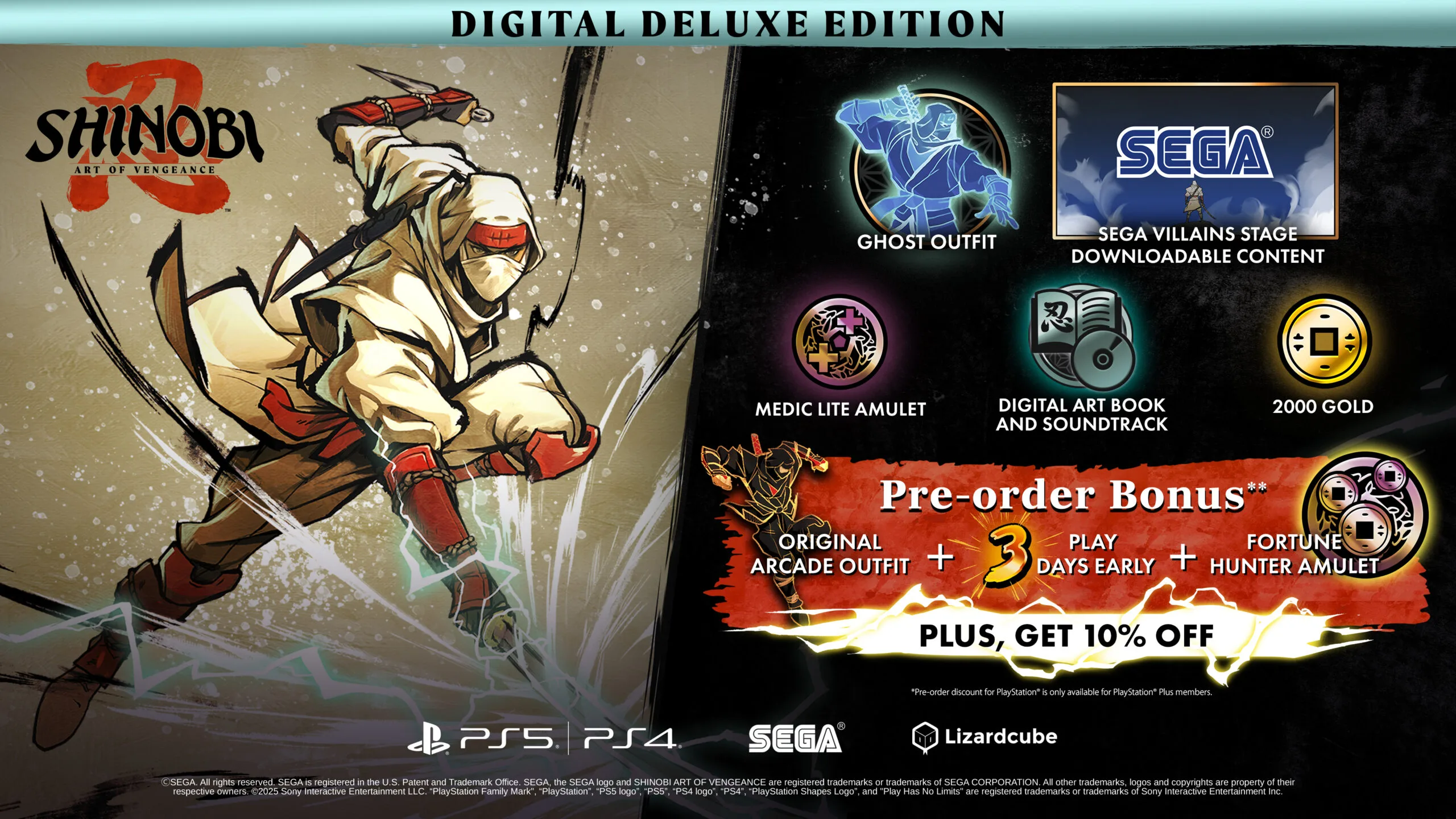 Αυτή τη στιγμή μπορείτε να προπαραγγείλετε το SHINOBI: Art of Vengeance στο PlayStation Store! Κάντε προπαραγγελία πριν τις 12:59 μ.μ. στις 29 Αυγούστου (JST) για να λάβετε 10%⇾ έκπτωση στην αγορά σας! Η Digital Deluxe Edition είναι επίσης διαθέσιμη για προπαραγγελία και περιλαμβάνει το βασικό παιχνίδι, ένα Starter Pack με αντικείμενα εντός παιχνιδιού, το SEGA Villains Stage (διαθέσιμο στις αρχές του 2026), με αφεντικά εμπνευσμένα από εμβληματικούς κακούς της SEGA, καθώς και Digital Art Book + Soundtrack.