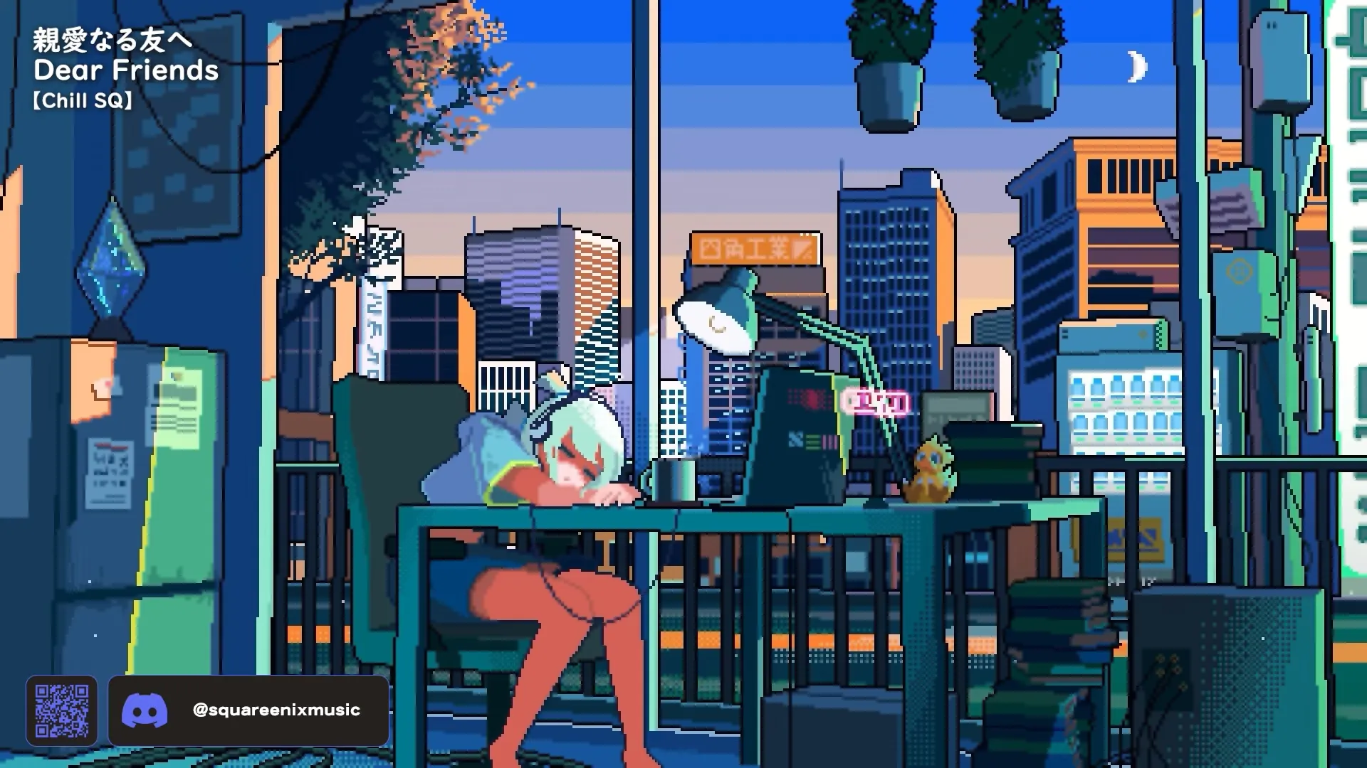 Η οπτική αισθητική του Chill Square Enix Music έχει πολλά κοινά με την αρχική Lofi Girl, αλλά αποτυπωμένη σε έναν χαριτωμένο στυλ pixel art. Στην εικόνα του φόντου, μια γυναίκα με ανοιχτό μπλε μαλλί κοιμάται μπροστά σε μια οθόνη laptop. Φοράει ακουστικά με καλώδιο και έχει μια κούπα με (πιθανώς) κάποιο καφεϊνούχο ρόφημα. Τα παράθυρα από το δάπεδο μέχρι την οροφή πίσω της αποκαλύπτουν μια όμορφη θέα με ψηλά κτίρια και μερικά κρεμαστά φυτά. Μπορείς επίσης να δεις μια λωρίδα του φεγγαριού, και της λέω, βρες καλύτερη ισορροπία μεταξύ εργασίας και ζωής, κορίτσι.