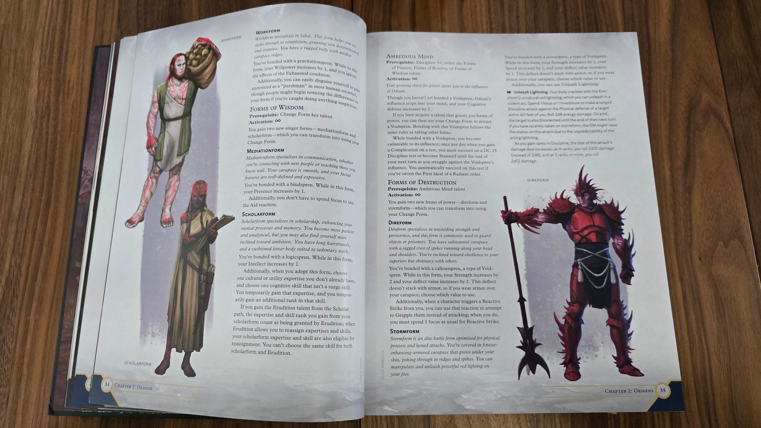 Αντί να διαλέξετε μια παραδοσιακή κλάση όπως Warrior ή Druid, επιλέγετε ένα Heroic Path, όπως Hunter, Leader ή Agent, το καθένα με το δικό του δέντρο ικανοτήτων και εξειδικεύσεις. Υπάρχουν έξι βασικά Heroic Paths (Agent, Envoy, Hunter, Leader, Scholar, Warrior) στο Stormlight Handbook, το καθένα με τρεις εξειδικεύσεις και ένα Key Talent που το ξεχωρίζει. Με το ανέβασμα επιπέδου, δεν ανεβάζετε κλάση αλλά τον ίδιο τον χαρακτήρα σας, επιλέγοντας αν θα συνεχίσετε στο ίδιο μονοπάτι ή θα δοκιμάσετε κάποιο νέο, ανάλογα με την εξέλιξη της ιστορίας σας. Δεν υπάρχουν περίπλοκοι κανόνες για multi-class ή διαφορετικά hit dice για ζωή, κάνοντας τη δημιουργία σύνθετων χαρακτήρων πιο προσιτή και τη διαδικασία του leveling πιο γρήγορη.