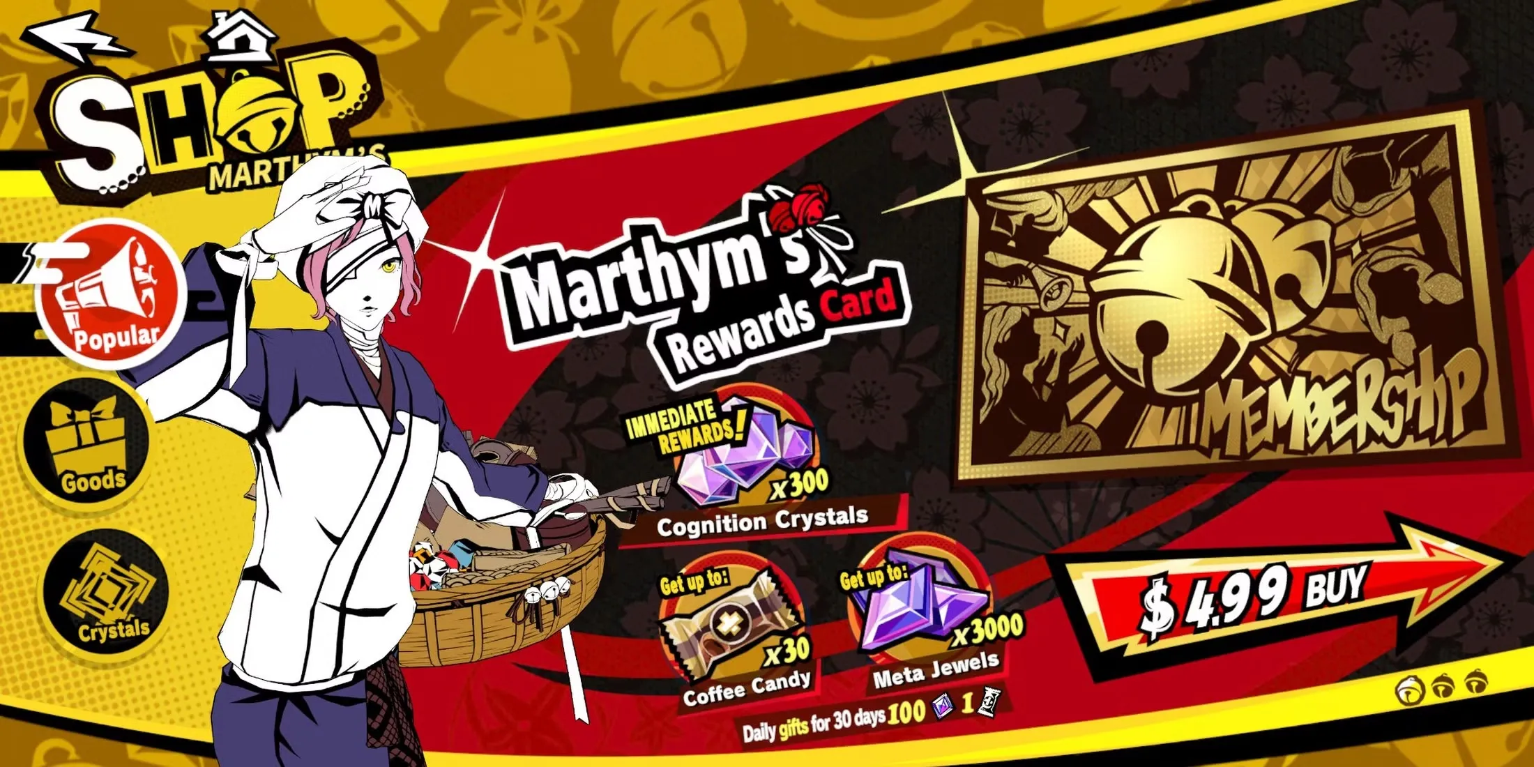 Αγοράζοντας την Κάρτα Επιβραβεύσεων Marthym, θα λάβετε αμέσως 300 Κρύσταλλους Γνώσης, 100 Μετα Τζεούλς και μια Καραμέλα Καφέ. Στη συνέχεια, μπορείτε να συνδεθείτε στο P5X καθημερινά για να διεκδικήσετε μια επιπλέον Καραμέλα Καφέ και 100 Μετα Τζεούλς. Αυτό διαρκεί για 30 ημέρες, οπότε θα αποκτήσετε συνολικά 3,000 Μετα Τζεούλς και 30 Καραμέλες Καφέ μέχρι το τέλος του μήνα.