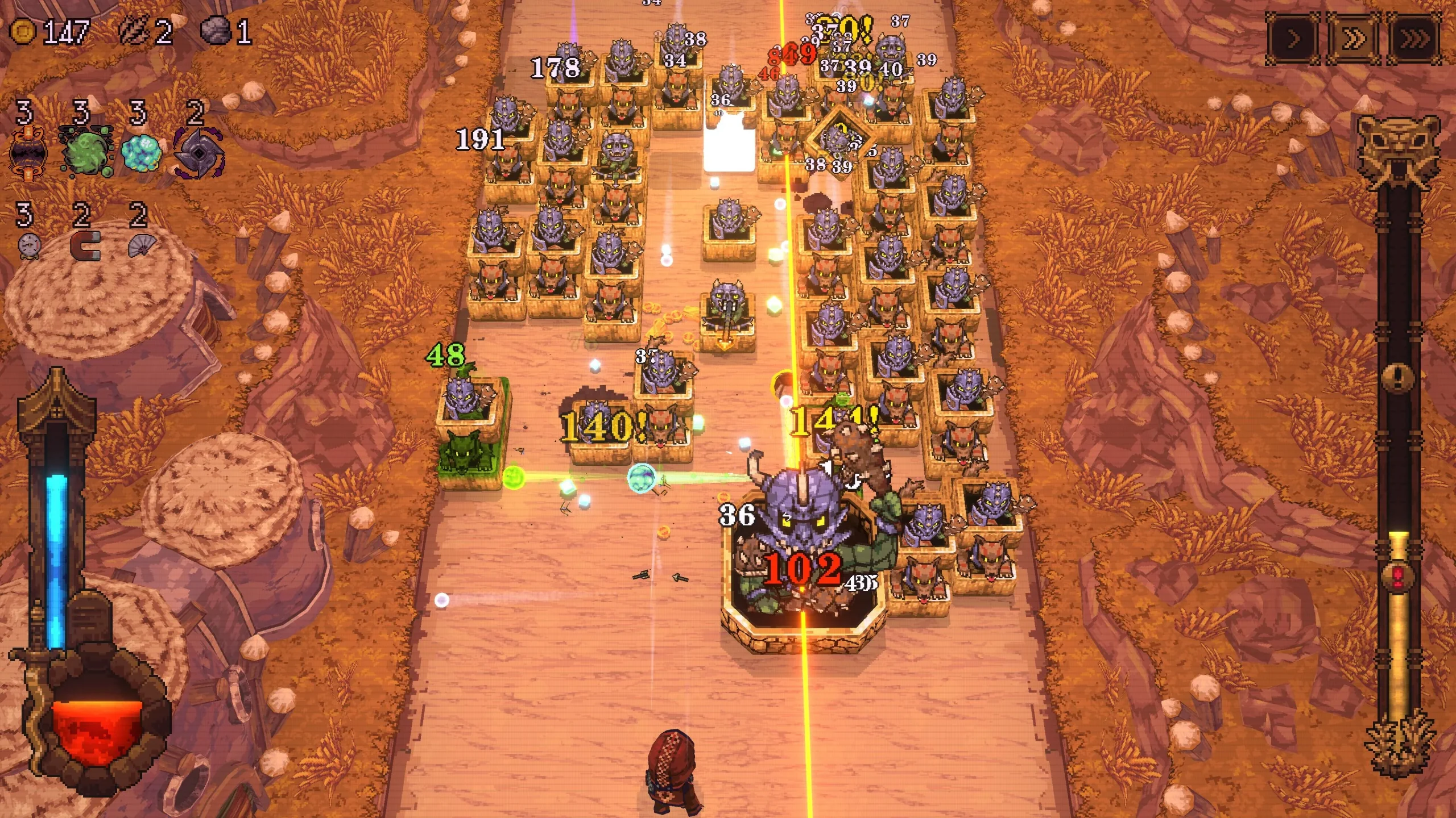 Αφού τεθεί το “σενάριο”, το Ball x Pit χωρίζεται σε δύο ξεχωριστούς κύκλους παιχνιδιού που αλληλοσυμπληρώνονται. Ο βασικός πυρήνας είναι το arcade brick-breaking mode, όπου ελέγχεις κατοίκους που κινούνται σε κάθετα κυλιόμενο πεδίο μέσα στον λάκκο, εκτοξεύοντας μπάλες με διάφορα μαγικά, εκρηκτικά ή άλλα εφέ. Οι μπάλες αναπηδούν στους τοίχους και σε σειρές από εχθρικά πλάσματα που κατεβαίνουν αργά προς τα κάτω. Όπως στα κλασικά παιχνίδια που το ενέπνευσαν, υπάρχει μια ιδιαίτερη ικανοποίηση στο να υπολογίζεις τη φυσική και την τροχιά της κάθε βολής, μεγιστοποιώντας τις αναπηδήσεις και απολαμβάνοντας το “ποπ” κάθε φορά που καθαρίζεις έναν εχθρό.