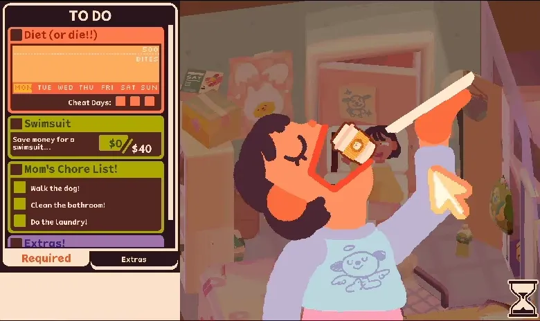 Το παιχνίδι που θα παίξεις πιο συχνά σε βάζει να φτιάξεις το πιάτο του μεσημεριανού της Jenny. Τα φαγητά εμφανίζονται ως κομμάτια τύπου Tetris που πρέπει να τοποθετήσεις σε ένα πλέγμα, γεμίζοντας τα τετράγωνα της πείνας και αποφεύγοντας τα κενά. Κάθε φαγητό κοστίζει διαφορετικό αριθμό «μπουκιών» (η αφηρημένη εκδοχή των θερμίδων στο παιχνίδι), οπότε πρέπει να ισορροπήσεις το πώς θα χωρέσεις τα κομμάτια στο πλέγμα αποφεύγοντας τα ανθυγιεινά τρόφιμα για να κρατήσεις χαμηλά τον αριθμό των μπουκιών. Αν ξεπεράσεις το όριο, θα πρέπει να γυμναστείς αργότερα, χάνοντας πολύτιμο χρόνο που θα μπορούσες να αφιερώσεις σε άλλες δραστηριότητες. Αν δεν διαχειριστείς σωστά τα κομμάτια, δεν θα γεμίσεις όλα τα απαραίτητα τετράγωνα και η μπάρα πείνας της Jenny θα μειωθεί. Παρά τον δυσάρεστο στόχο, απολαμβάνω αυτό το παζλ και δεν με πειράζει να το παίζω κάθε μέρα στο παιχνίδι.