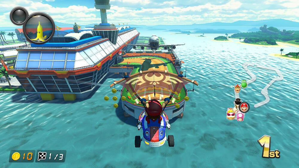 Ορισμένες πίστες Mario Kart διαδραματίζονται σε μέρη που δείχνουν ότι ο κόσμος του Mario έχει σύγχρονες υποδομές. Το Sunshine Airport μετατρέπει το αεροδρόμιο σε πίστα, με αεροπλάνα ως εμπόδια και λεπτομέρειες όπως ο χώρος αποσκευών να προσθέτουν χαρακτήρα.