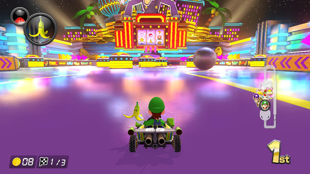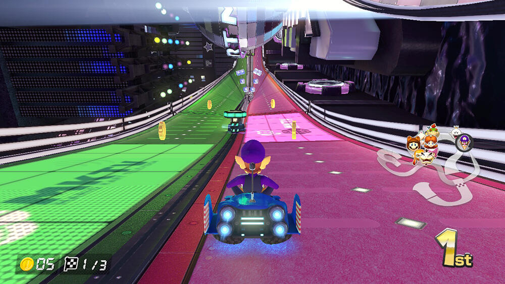 Η πίστα pinball του Waluigi είναι γεμάτη χρώμα, στενά μονοπάτια και μια σήραγγα που εκτοξεύει το kart σου με απίστευτη ταχύτητα. Η ανοιχτή περιοχή με τα bumpers και τα flippers προσθέτει επιπλέον πρόκληση.