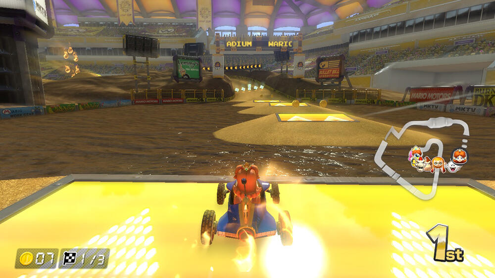 Το Wario Stadium αποτίει φόρο τιμής σε αγώνες τύπου ExciteBike και rallycross, με τεράστιες ράμπες, λάσπη και φωτιές, αποτυπώνοντας τέλεια το στυλ του Wario.