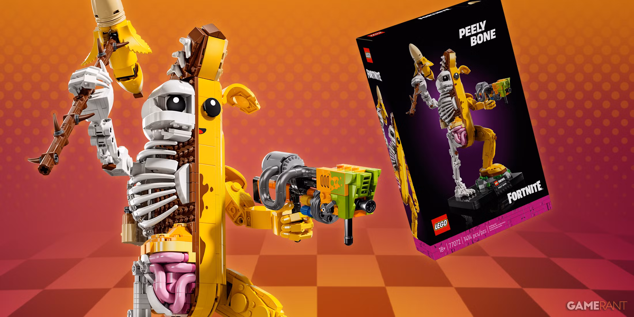 Μέσα στο κουτί, υπάρχει ένα LEGO σετ που περιλαμβάνει 1,414 κομμάτια από καθαρή τρόμο μπανάνα. Μόλις ολοκληρωθεί αυτός ο υβριδικός σκελετός-μπανάνα, οι θαυμαστές της τρομακτικής φιγούρας θα αποκτήσουν έναν Peely Bone ύψους 14 ιντσών έτοιμο να πολεμήσει στο Battle Royale.