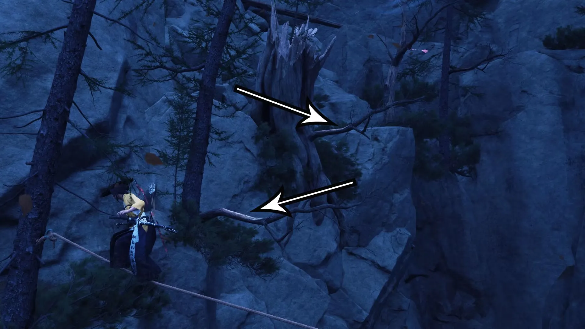 Θα χρειαστεί να σπάσετε ακόμα ένα κλαδί και να πηδήξετε πάνω του για να φτάσετε σε δύο γέφυρες από μπαμπού. Στο τέλος της δεύτερης, κοιτάζοντας δεξιά, θα δείτε έναν σπασμένο κορμό δέντρου με κόκκινα και λευκά σχοινιά. Πηδήξτε και χρησιμοποιήστε το γάντζο σας. Έπειτα, σκαρφαλώστε στον βράχο κοντά στην άκρη για να περάσετε στην επόμενη περιοχή.