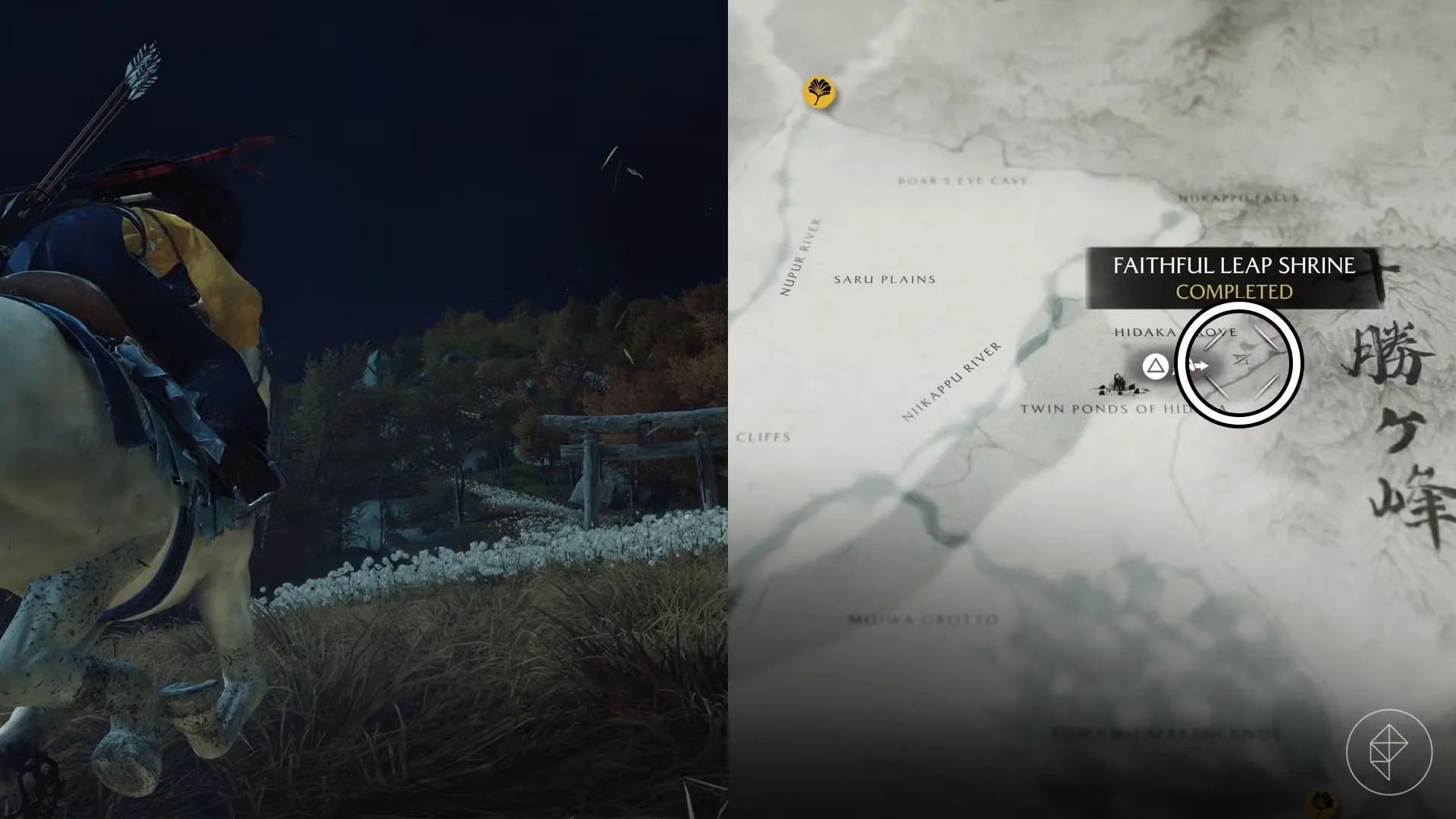 Αν δεν έχετε επισκεφθεί ξανά την περιοχή, ένα καλό σημείο εκκίνησης είναι το Yōtei’s Shadow Inn. Από εκεί, κινηθείτε βόρεια μέχρι να συναντήσετε τον ποταμό Nupur και ακολουθήστε τον προς τα βορειοανατολικά. Η περιοχή Twin Ponds of Hidaka βρίσκεται ανάμεσα στον ποταμό Nikappu και τα Tomamu Marshlands. Όταν δείτε ένα μακρύ μονοπάτι με λευκά λουλούδια, ακολουθήστε το για να βρείτε την πρώτη πύλη που σηματοδοτεί το σημείο του ιερού.