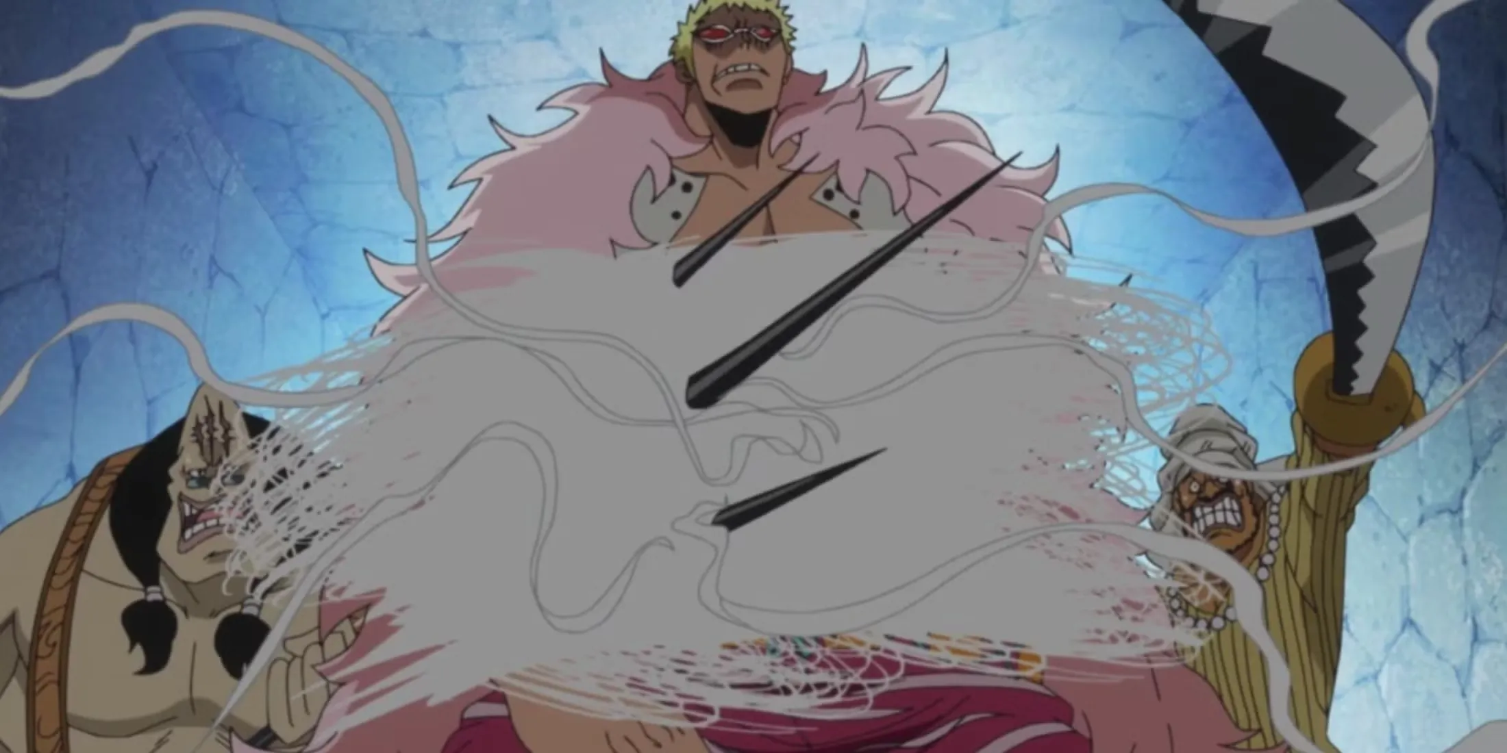 Ο Donquixote Doflamingo, πρώην Celestial Dragon, σκότωσε τον πατέρα και τον αδερφό του για να ανακτήσει την εξουσία. Πολλές από τις πιο αιμοδιψείς πράξεις του δεν φαίνονται άμεσα. Εκτός από το εμπόριο SMILEs, όπλων και σκλάβων, έχει σκοτώσει όλους τους μνηστήρες της Baby 5. Η Baby 5, πρώην υφιστάμενή του, είχε την τάση να δέχεται κάθε πρόταση γάμου λόγω της ανάγκης της για αποδοχή. Ο Doflamingo, με τον δικό του διαστρεβλωμένο τρόπο, τη “προστάτευε” σκοτώνοντας τους μνηστήρες της και καταστρέφοντας τις πόλεις τους, με αποτέλεσμα να πεθαίνουν και αθώοι. Τελικά, ο ένατος μνηστήρας της, ο Sai, την ώθησε να προδώσει το πλήρωμα και να ενταχθεί στους Happo Navy υπό τη Straw Hat Grand Fleet. Ακόμα και στη φυλακή, ο Doflamingo παραμένει αιμοδιψής, απολαμβάνοντας την πτώση των World Nobles.