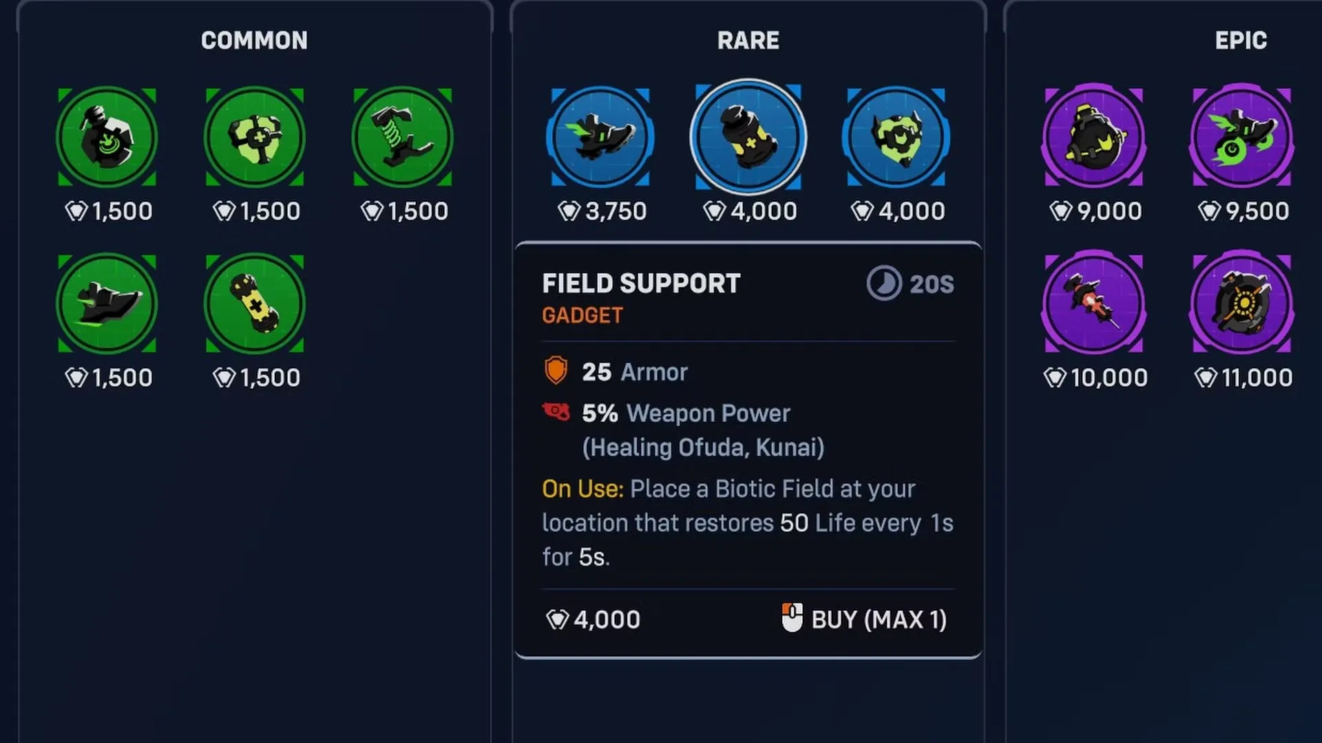 - Για όσους αναζητούν οικονομικές λύσεις, το Field Support είναι ιδανικό. Με τιμή μόλις 4,000, προσφέρει το Biotic Field του Soldier 76 με cooldown 20 δευτερολέπτων. Η ζώνη θεραπείας διαρκεί πέντε δευτερόλεπτα, αφήνοντας μόνο 15 δευτερόλεπτα downtime ανάμεσα στα heals.