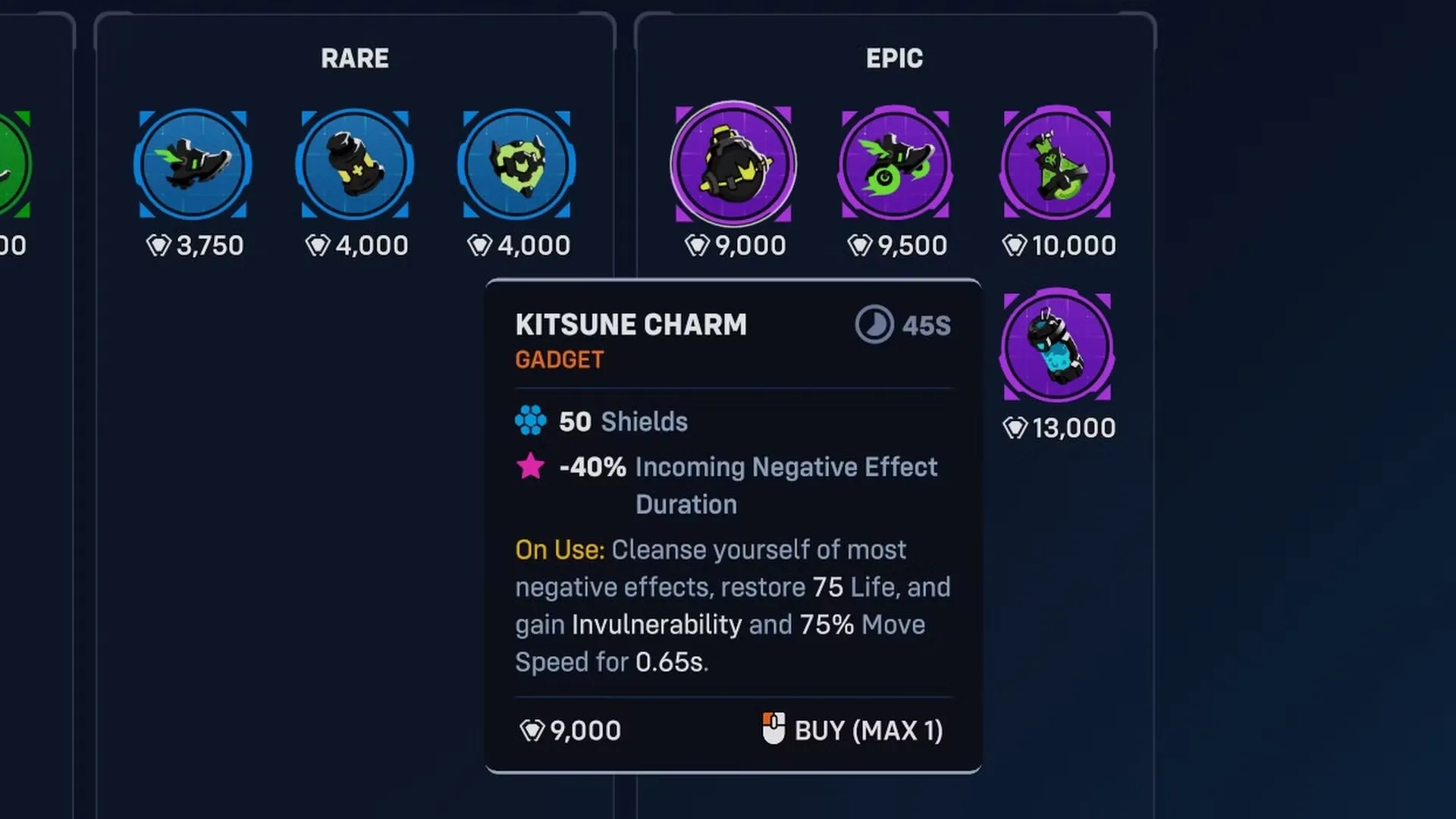 Kitsune Charm | 9000 | 50 Shields -40% Incoming Negative Effect Duration On Use: Cleanse and gain immunity for 1.5s. 45s cooldown. |