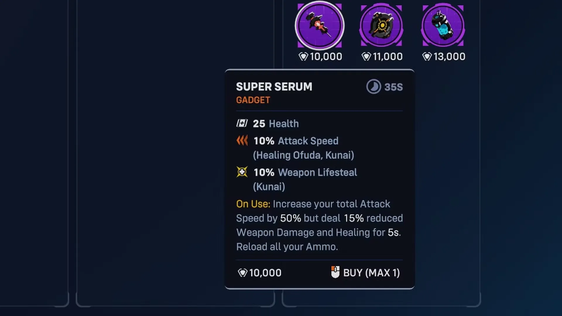 - Το Super Serum είναι μια εξαιρετική επιλογή για κάθε ρόλο. Κάθε 45 δευτερόλεπτα, αυξάνει το συνολικό Attack Speed κατά 50%, με μια μικρή μείωση σε damage και healing. Επιπλέον, προσφέρει 10% αύξηση σε Attack Speed και Weapon Lifesteal, ταιριάζοντας ιδανικά στα περισσότερα DPS builds.
