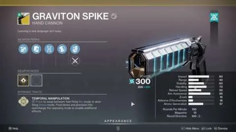 Με την άφιξη του Destiny 2: The Edge of Fate, εισάγονται πολλές αλλαγές. Υπάρχει το νέο σύστημα Portal, μια καινούρια τοποθεσία για εξερεύνηση και αρκετά νέα Exotics. Ανάμεσά τους βρίσκεται το Graviton Spike, ένα hand cannon 150 RPM με δύο τρόπους βολής. Η λειτουργία Arc προσφέρει πολύ γρήγορο ρυθμό πυροδότησης, ενώ η Stasis είναι πιο αργή αλλά προκαλεί μεγαλύτερη ζημιά.