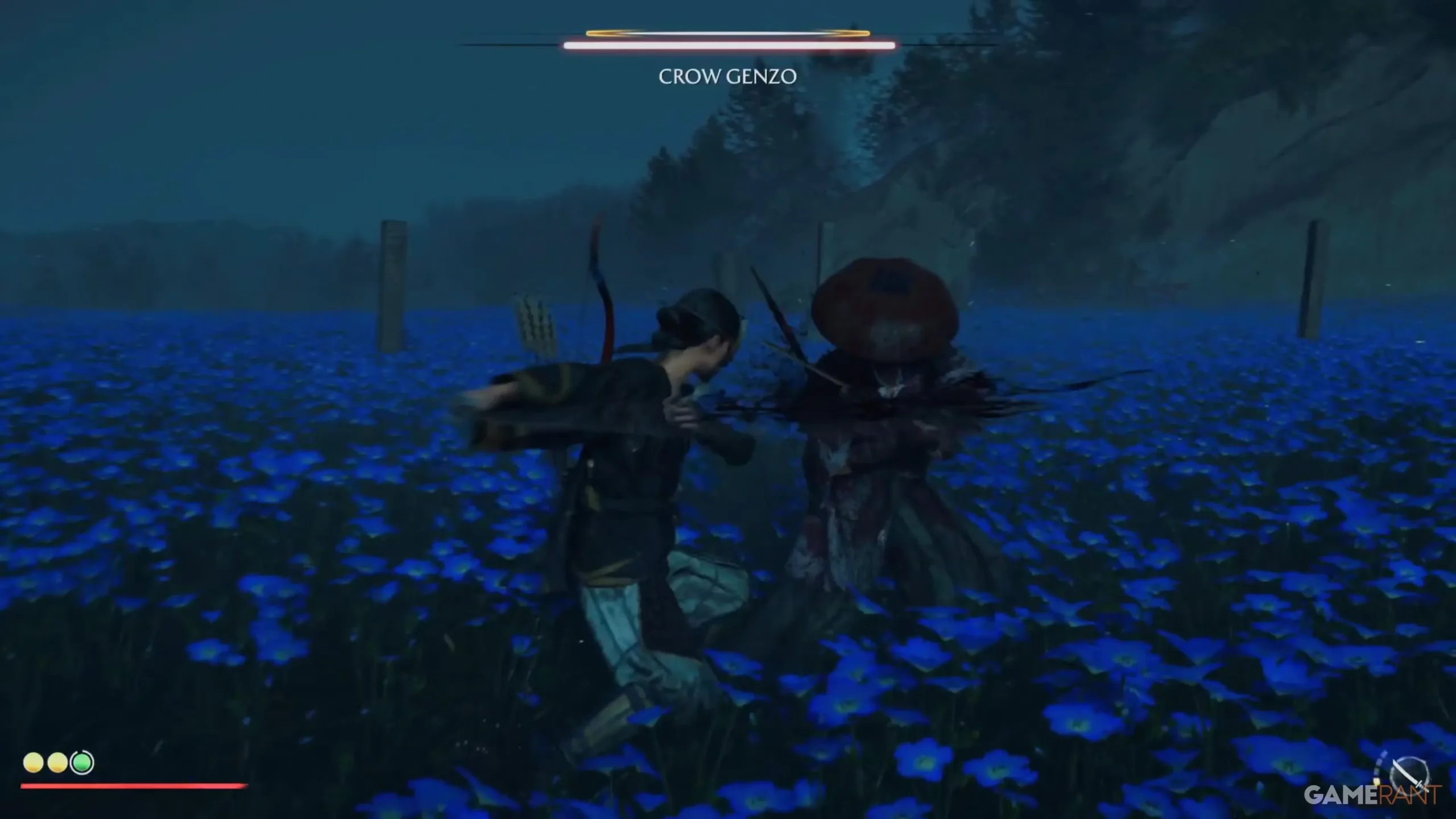 Ανεξάρτητα από το αν στήσετε καταυλισμό, μπορείτε να συνεχίσετε βόρεια από το σημείο αυτό και σύντομα θα φτάσετε στο Blue-Flowered Cemetery. Μπείτε μέσα και κατευθυνθείτε ευθεία προς το Altar που διακρίνετε στο βάθος. Εκεί θα αντιμετωπίσετε τον Crow Genzo σε μονομαχία. Αν καταφέρετε να τον νικήσετε, θα αποκτήσετε το Metsubushi, ένα Quickfire Weapon.