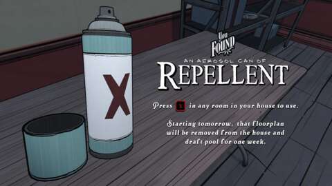Το Repellent έχει ενδιαφέροντα αποτελέσματα. Όταν είναι στην αποθήκη σας, μπορείτε να πατήσετε “X” σε ένα δωμάτιο μέσα στην έπαυλη. Αυτό θα αφαιρέσει το δωμάτιο από το σπίτι και την επιλογή σας για μία εβδομάδα.