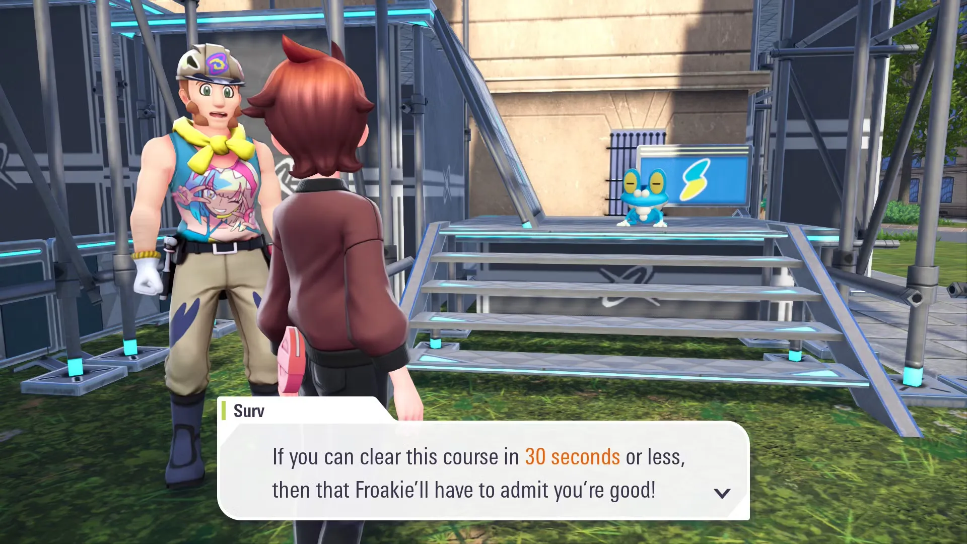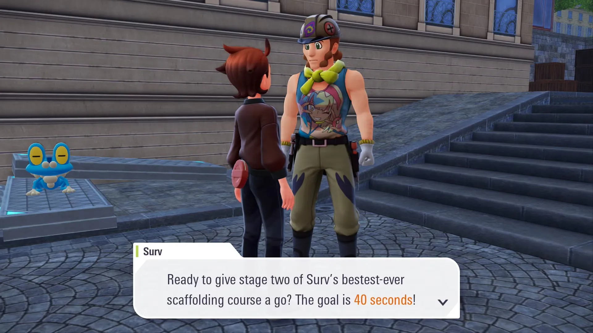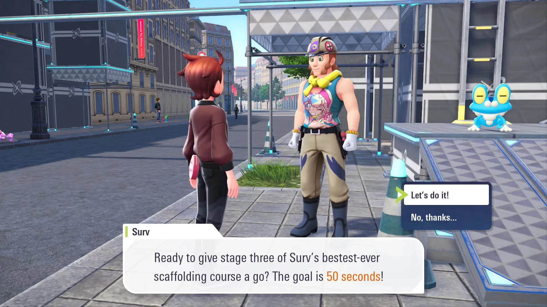 Μιλήστε με τον υπεύθυνο του εργοταξίου και θα μάθετε ότι το Froakie δίπλα του έχει σημειώσει ρεκόρ χρόνου σε τρεις διαφορετικές διαδρομές με εμπόδια πάνω στις σκαλωσιές. Αποδεχτείτε την πρόκληση να ξεπεράσετε το χρόνο του και θα ξεκινήσετε την αποστολή ‘A Challenge from Froakie’ στο Pokemon Legends Z-A.