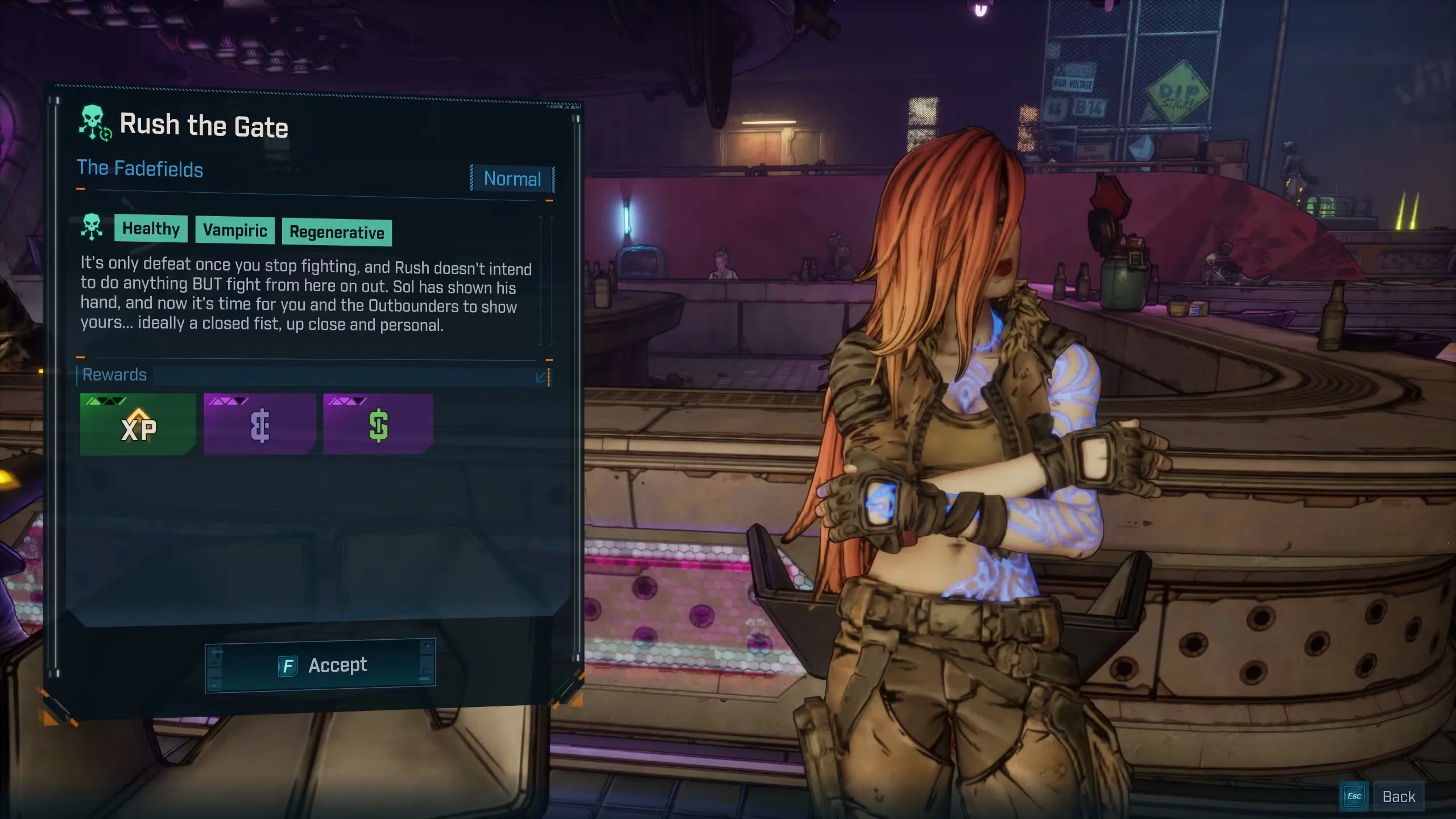 Αφού εξοντώσουν τα 4 απαιτούμενα bosses, οι παίκτες επιστρέφουν στη Lilith στο Moxxi’s Bottoms Up, στην περιοχή Carcadia Burn. Εκεί, η Lilith δίνει μια νέα αποστολή, μια Wildcard εκδοχή του Rush the Gate. Η αποστολή τελειώνει με μάχη ενάντια στον Sol, με εχθρούς που έχουν ενισχύσεις: Healthy, Vampiric και Regenerative. Μετά την ολοκλήρωση, οι παίκτες προχωρούν αυτόματα στο Ultimate Vault Hunter 2.