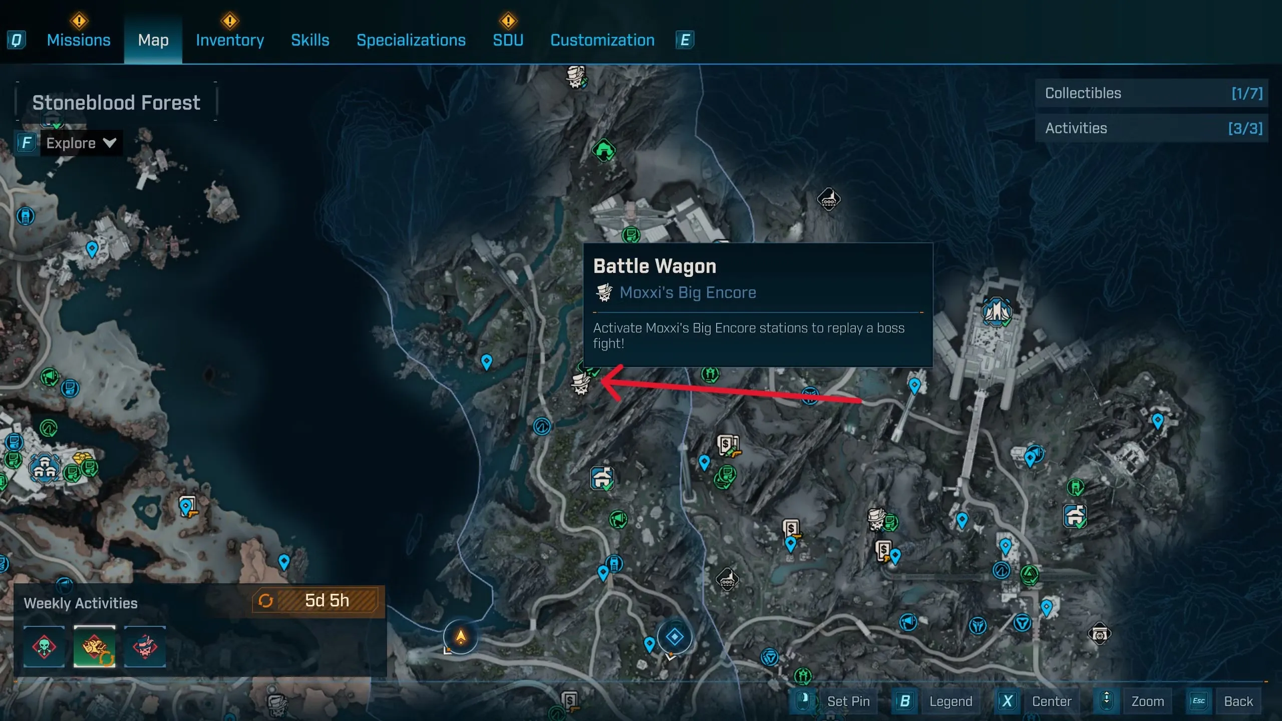 Το Battle Wagon βρίσκεται στο The Lowering March Drill Site, στο Stoneblood Forest του Terminus Range. Εμφανίζεται μετά την εξόντωση όλων των Rippers της περιοχής και είναι ευάλωτο σε ζημιά από φωτιά, αλλά προσέξτε τους πυραύλους του.