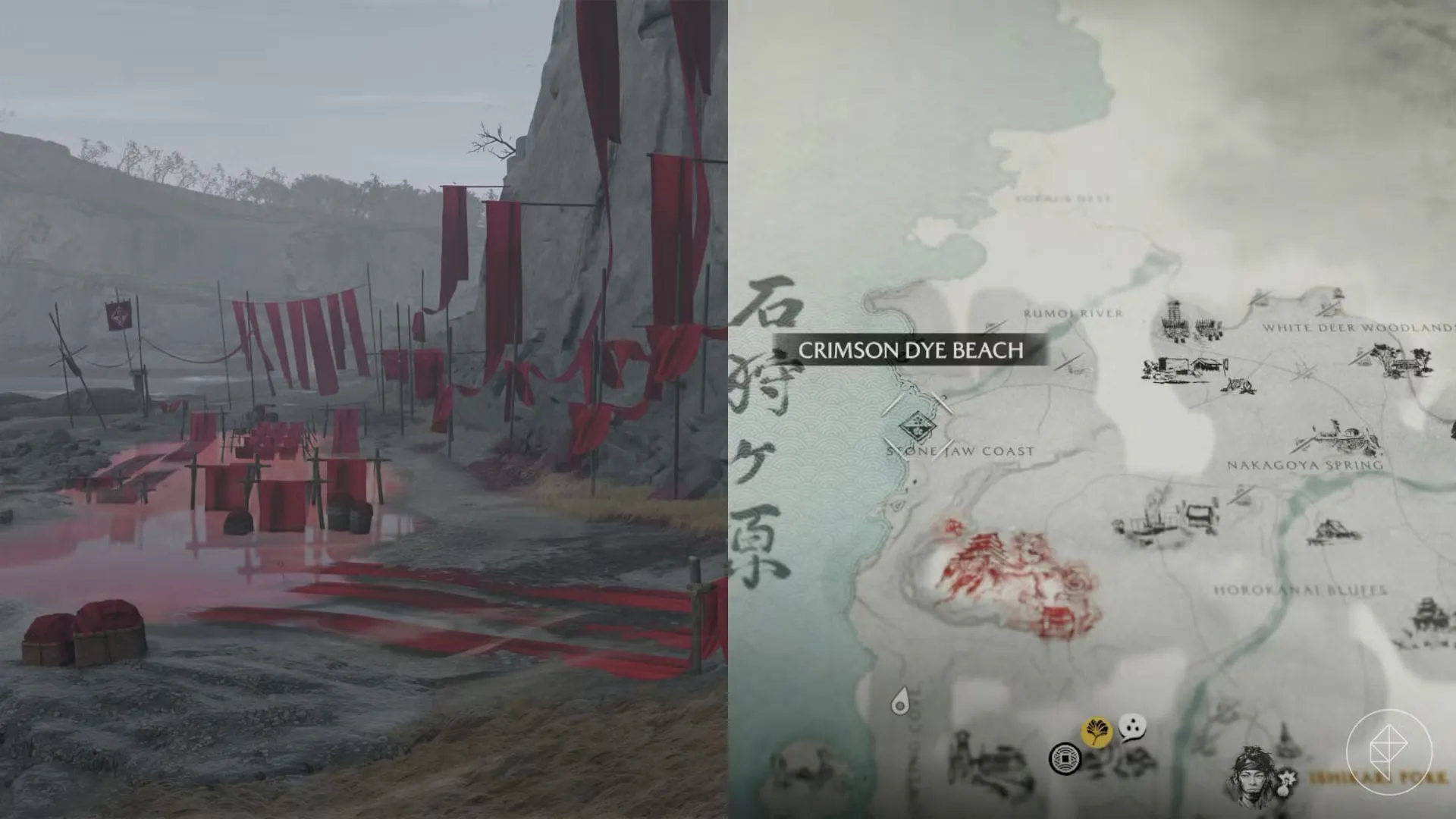 Για να καλέσετε το πλοίο του εμπόρου στην παραλία Crimson Dye, κατευθυνθείτε προς την Stone Jaw Coast, ακριβώς βόρεια από το Ishikari Castle, στην περιοχή Ishikari Plains. Κοιτάξτε δίπλα στην πινακίδα για να εντοπίσετε μια φωτιά κατασκήνωσης. Ανάψτε τη φωτιά και θα ξεκινήσει μια σκηνή όπου το πλοίο και ο Crimson Dye Merchant φτάνουν στην ακτή.