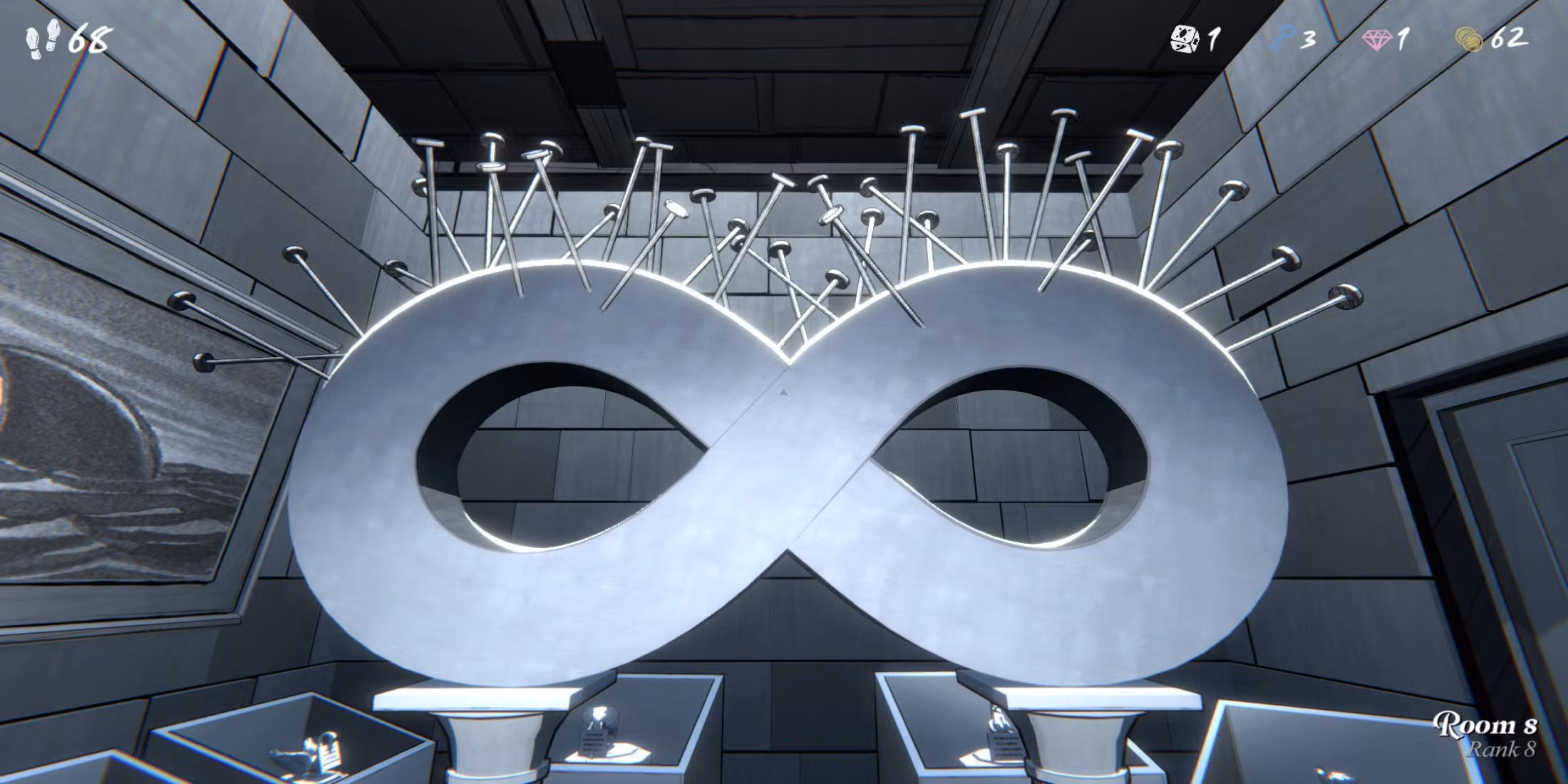 Μέσα σε αυτό το παράξενο δωμάτιο, θα συναντήσετε έναν μεγάλο αριθμό οκτώ που μοιάζει περισσότερο με το σύμβολο του άπειρου. Κατά μήκος του τοίχου, θα υπάρχουν επίσης οκτώ αγάλματα:
