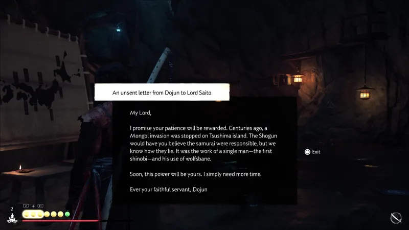 Το wolfsbane ήταν το δηλητήριο που χρησιμοποίησε ο Jin Sakai στο Tsushima, κάτι που ο θείος του θεωρούσε ανέντιμο. Το έγγραφο που βρίσκει η Atsu αναφέρει: «Η υπομονή σας θα ανταμειφθεί. Πριν από αιώνες, μια μογγολική εισβολή σταμάτησε στο νησί Tsushima. Ο Σογκούν θα ήθελε να πιστεύετε ότι οι σαμουράι ήταν υπεύθυνοι, αλλά ξέρουμε πώς λένε ψέματα. Ήταν το έργο ενός μόνο ανθρώπου – του πρώτου shinobi – και της χρήσης του wolfsbane.»