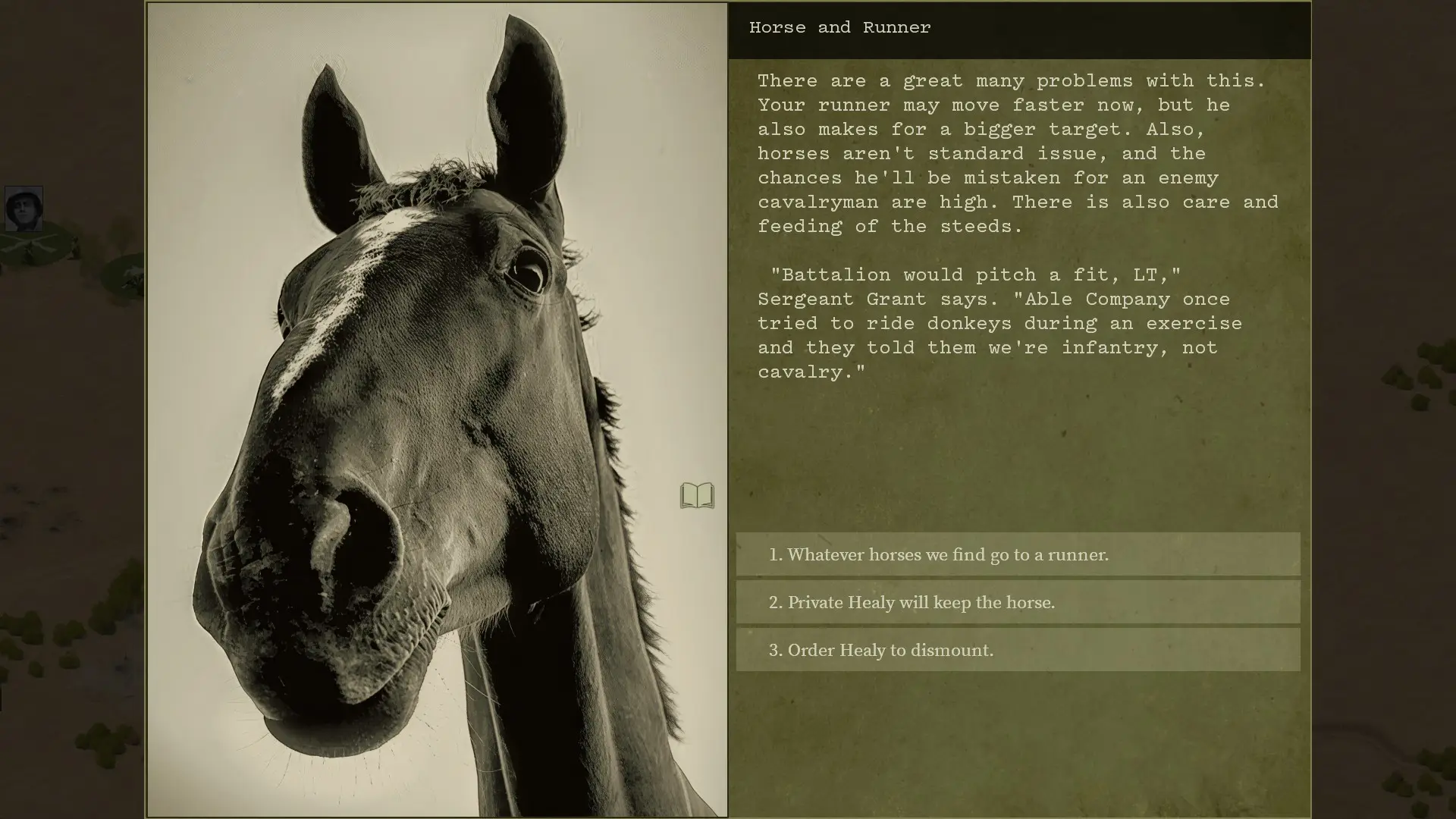 Οι αδυναμίες του αποσπούν την προσοχή από τη μεγάλη του δύναμη – είναι, ουσιαστικά, πολύπλοκη διαδραστική αφήγηση. Όταν δεν είσαι σε μάχες, διαβάζεις για γεγονότα γύρω τους, χειρίζεσαι τις περιπέτειες των ανδρών, γράφεις επιστολές σε οικογένειες που θα θρηνήσουν σύντομα. Υπάρχει εκτίμηση για τους άνδρες και τους ανώτερους (όχι αντίθετοι, αλλά οι τελευταίοι θέλουν κυρίως στρατηγικά αποτελέσματα, ενώ οι πρώτοι θέλουν να επιβιώσουν) που πρέπει να κερδίσεις, η δική σου ευημερία και οι σχέσεις με άλλους αξιωματικούς που πρέπει να ισορροπήσεις ενόψει της προετοιμασίας για την επόμενη μάχη και της σωστής δράσης. Η γραφή είναι ήσυχα εξαιρετική, με μια ελαφριά στοϊκή διάθεση που δεν γέρνει σε πατριωτισμό, δραματικότητα ή πολεμική πορνογραφία. Πολλή έρευνα έχει γίνει, αλλά ένα εντυπωσιακά συγκρατημένο χέρι άφησε το μεγαλύτερο μέρος της εκτός πλάνου (“Έτσι είναι.”). Το αποτέλεσμα είναι μια αυθεντικότητα πνεύματος παρά τεχνικότητας, και συνοπτικό κείμενο που ωστόσο μεταφέρει αυτό που πρέπει. Εμπιστεύεται το κοινό να κατανοήσει και να συμπεράνει πράγματα, που αξίζει το κόστος του να πηγαίνει περιστασιακά πάνω από το κεφάλι μου, οδηγώντας στο κλασικό πρόβλημα διαλόγου RPG με τις απαντήσεις να μην σημαίνουν ακριβώς αυτό που νόμιζα.
