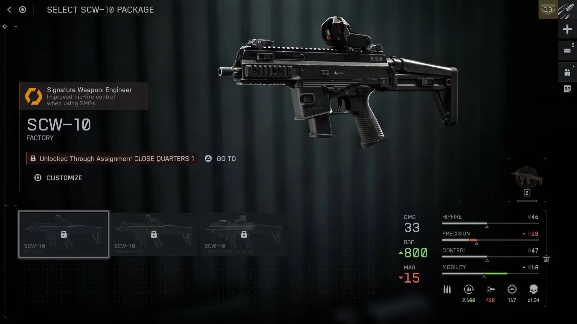 Το μειονέκτημα; Το SCW-10 διαθέτει μόνο 15 σφαίρες ανά γεμιστήρα και τις εξαντλεί πολύ γρήγορα, οπότε θα χρειαστεί να επαναγεμίζετε σχεδόν μετά από κάθε εξουδετέρωση. Μπορείτε να αυξήσετε την ταχύτητα επαναγέμισης με εξαρτήματα όπως το Mag Catch, ενώ όταν το εξελίξετε περαιτέρω, τα γεμιστήρια των 20 ή 25 σφαιρών θα σας δώσουν μεγαλύτερη ευελιξία. Δεν αποδίδει καλά σε μεγάλες αποστάσεις, οπότε είναι ιδανικό για μάχες εξ επαφής.