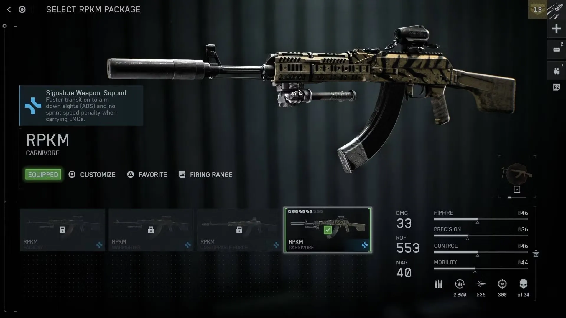 Η παραλλαγή Carnivore μετατρέπει το RPKM σε όπλο που θυμίζει περισσότερο τυφέκιο εφόδου ή καραμπίνα, καθιστώντας το κατάλληλο για κινητικό παιχνίδι, ειδικά με εξαρτήματα όπως το 419mm Boar-F κοντό κάννη και το R4T 2.00x οπτικό σκοπευτικό. Αν θέλετε να το προσαρμόσετε για μάχες μεγάλης εμβέλειας, εξοπλίστε το με Grip Pod κάτω λαβές, βαριές κάννες και οπτικά με μεγαλύτερη μεγέθυνση.