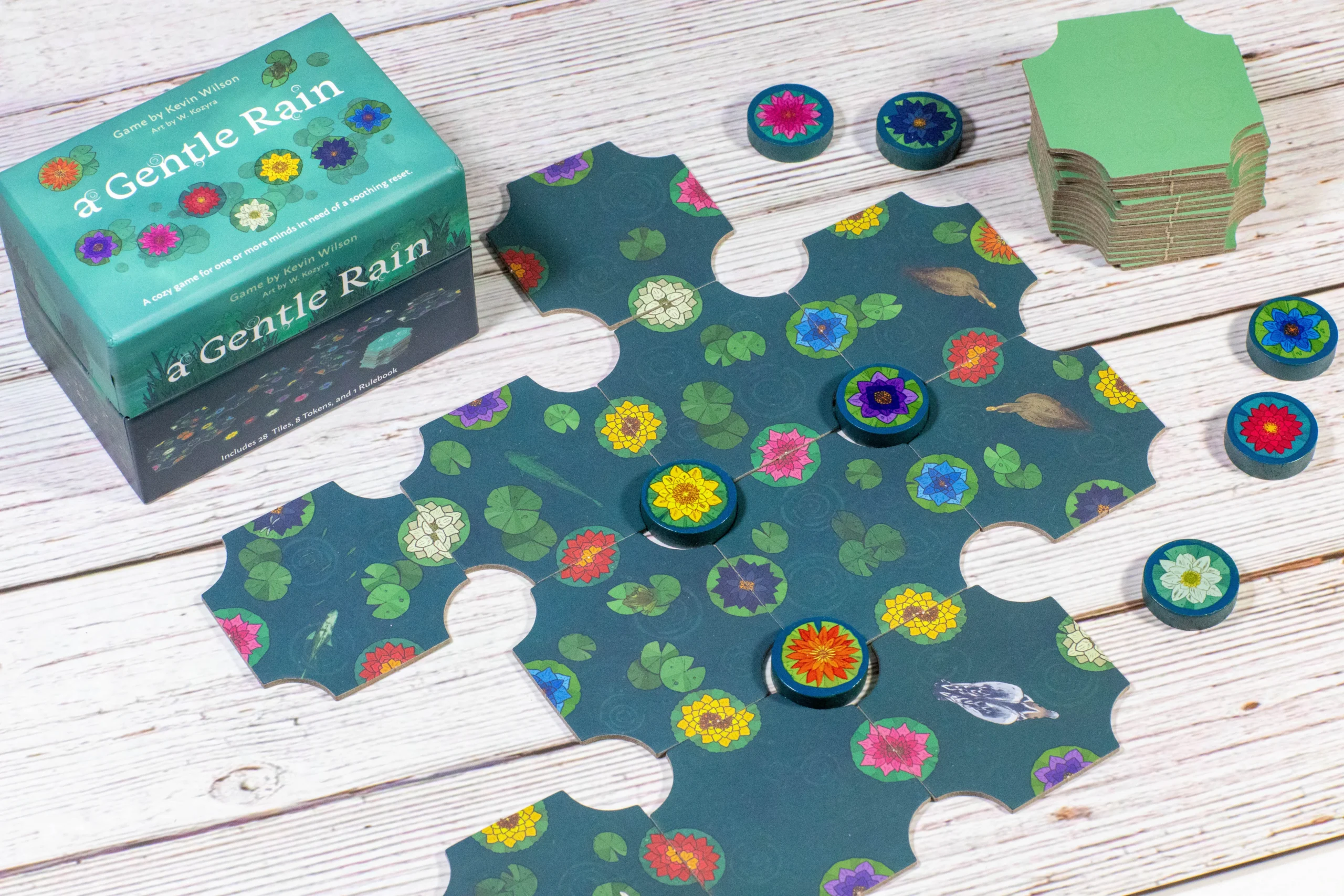Δημιουργημένο από τον Kevin Wilson (Arkham Horror, Descent: Journeys in the Dark, Kinfire Chronicles) και εκδιδόμενο από την Incredible Dream Studios, το A Gentle Rain είναι ένα παιχνίδι οικοδόμησης ταμπλό όπου ένας ή περισσότεροι παίκτες τραβούν τυχαία τετράγωνα και τα τοποθετούν στο τραπέζι, με στόχο την ανάπτυξη λωτών. Κάθε τετράγωνο έχει τέσσερα μισά-λουλούδια, τα οποία πρέπει να ταιριάξεις με μισά-λουλούδια του ίδιου χρώματος που είναι ήδη στο ταμπλό. Ένα κίτρινο μισό-λουλούδι συνδέεται με άλλο κίτρινο μισό-λουλούδι για να σχηματίσει ένα ολόκληρο λουλούδι. Αν ταιριάξεις τέσσερα πλακίδια σε ένα τετράγωνο, θα αποκαλύψεις μια κυκλική τσέπη που χωράει τέλεια ένα από τα οκτώ πλαστικά λωτά.