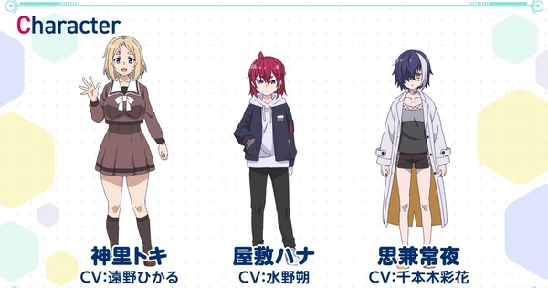 Στη σειρά πρωταγωνιστούν οι: Hika Tsukishiro ως Alma, Ryōta Suzuki ως Enji Kamisato, M.A.O ως Suzume Yobane, Rika Nagae ως Makina και Hinaki Yano ως Neon. Τη σκηνοθεσία αναλαμβάνει ο Yasuhiro Minami (γνωστός από Gintama, Turn A Gundam) στο Studio Flad. Η Yukie Sugawara (Overlord, Kino’s Journey – The Beautiful World) επιμελείται τα σενάρια, ενώ η Mika Yamamoto (ClassicaLoid, Tiger & Bunny 2) σχεδιάζει τους χαρακτήρες. Το εναρκτήριο τραγούδι “Dramatic Overlay” ερμηνεύει η ZAQ και το τραγούδι τέλους “Arifuretetai” (Θέλω να είμαι απλή) η KAF.