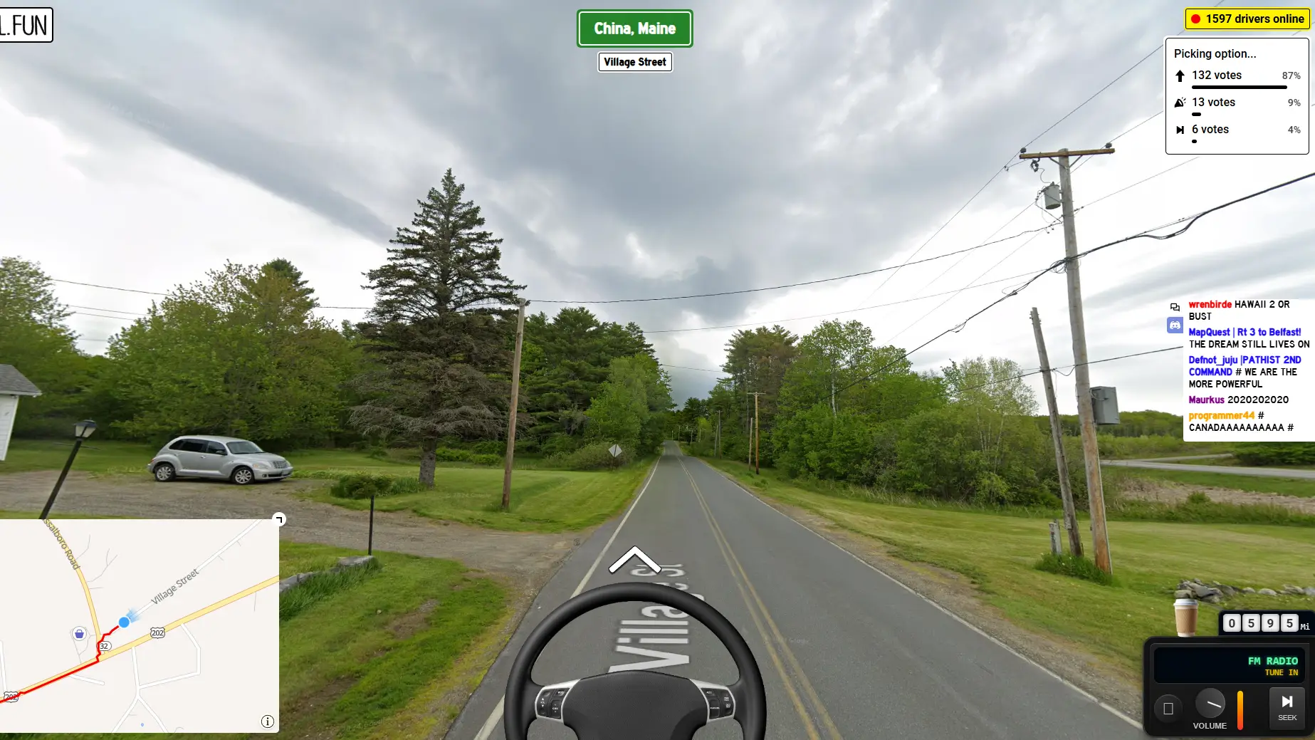 1610 λεγόμενοι “οδηγοί” είναι αυτή τη στιγμή online, διασχίζοντας τους αυτοκινητόδρομους της Νέας Αγγλίας μέσω εικόνων από το Google Streetview που ανανεώνονται κάθε 10 δευτερόλεπτα. Όπως και με το φαινόμενο Twitch Plays Pokémon, οι θεατές μπορούν να ψηφίζουν συλλογικά για να καθορίσουν την κατεύθυνση που θα πάρει το αυτοκίνητο.