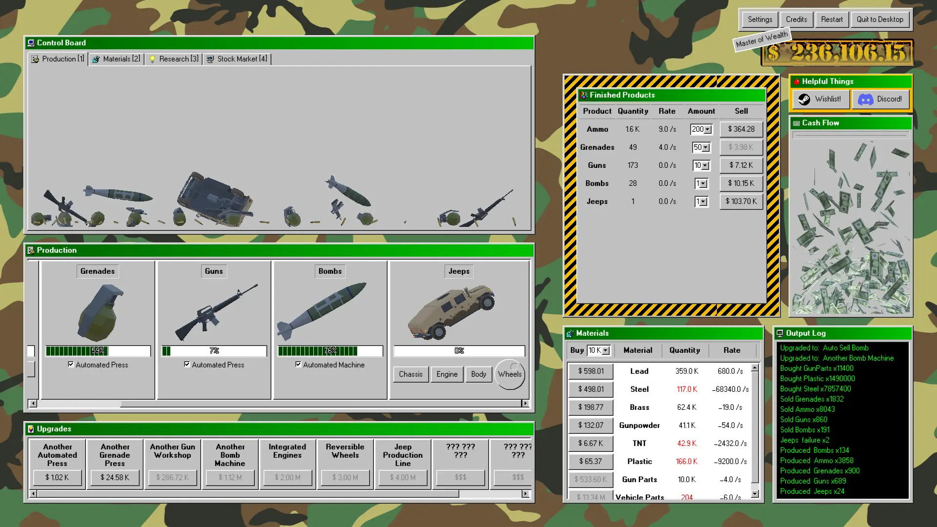 Ω, Dope Wars ’98, άφησέ με να μετρήσω τους τρόπους που με διαμόρφωσες στον άνθρωπο που είμαι σήμερα, αγοράζοντας υπερμεγέθη παλτά για να αποθηκεύσω τις 100 μονάδες οξέος μου. Το Military Incremental Complex αντλεί έμπνευση από τη χαρακτηριστική διεπαφή του ’98, αλλά αντί να παίζεις έναν cool και φιλόδοξο επιχειρηματία ηρωίνης, παίζεις έναν κακό έμπορο σφαιρών. Ξεκίνα να φτιάχνεις χειροποίητα φυσίγγια από φρέσκα προϊόντα και προχώρησε μέχρι τις πυρηνικές βόμβες. Τυπική προπαγάνδα ανανεώσιμων πηγών ενέργειας. Δεν μπορείς καν να πουλήσεις μεγάλες δέσμες δυναμίτη με την ένδειξη ‘TNT’ πάνω τους, μήπως και προσβάλεις τους κογιότ.