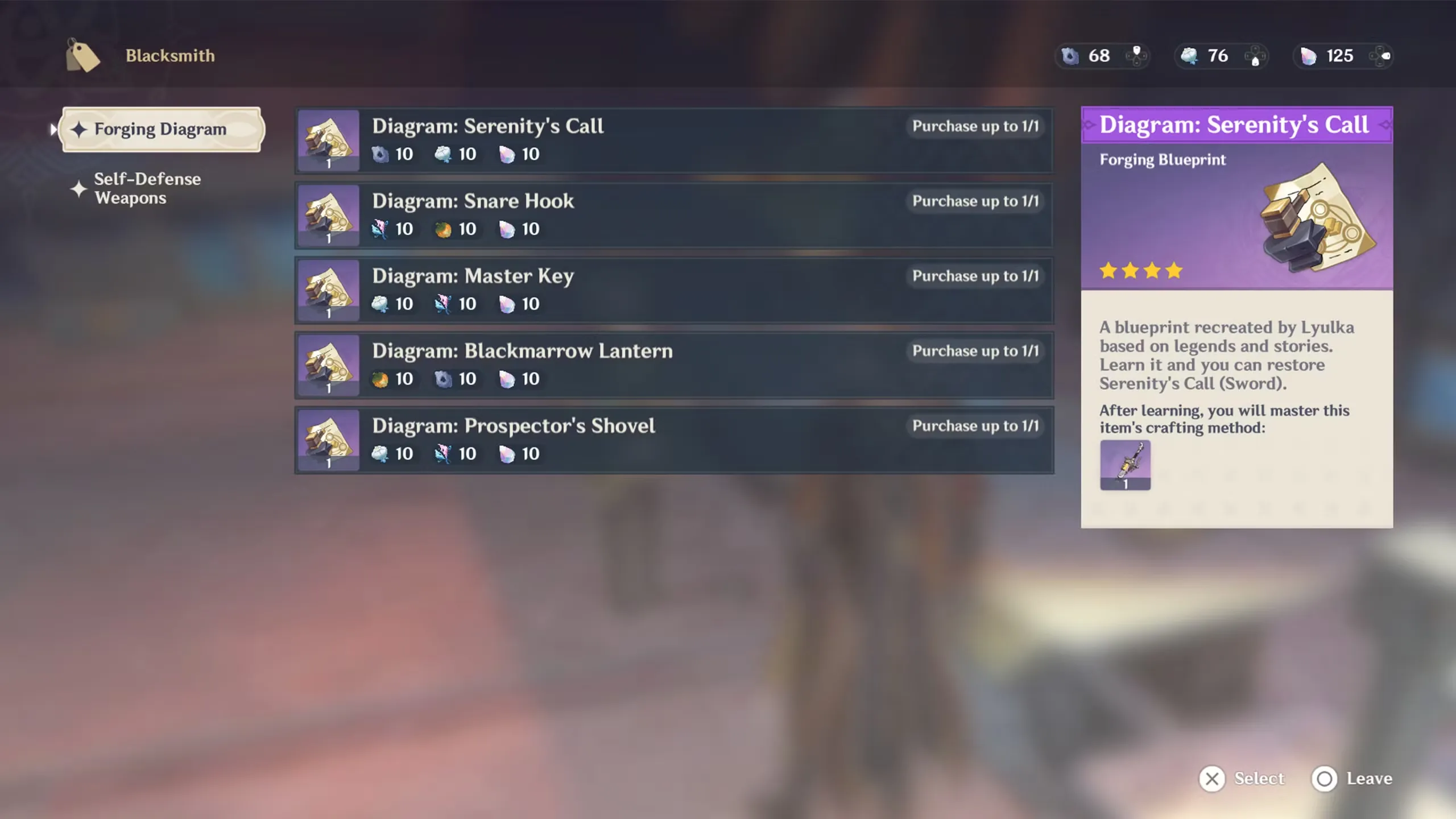 Serenity’s Call | 1 Borderland Sword Billet. 50 Rainbowdrop Crystal. 500 Mora. |