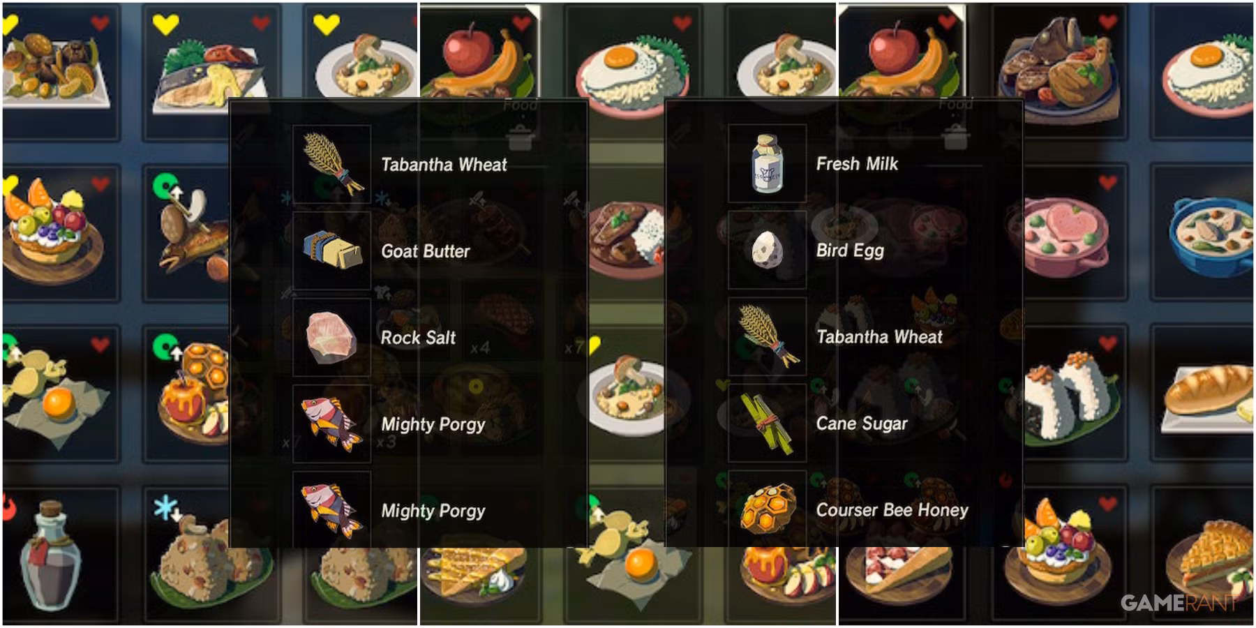 Περισσότερες από 100 συνταγές στο Breath of the Wild. Δυστυχώς, δεν υπάρχει βιβλίο συνταγών για να παρακολουθείς όλες τις συνταγές. Μπορείς να ελέγξεις τα υλικά επιλέγοντας ένα γεύμα και στη συνέχεια “Συνταγή”, αλλά είναι εύκολο να ξεχάσεις τι περιέχει κάθε πιάτο.
